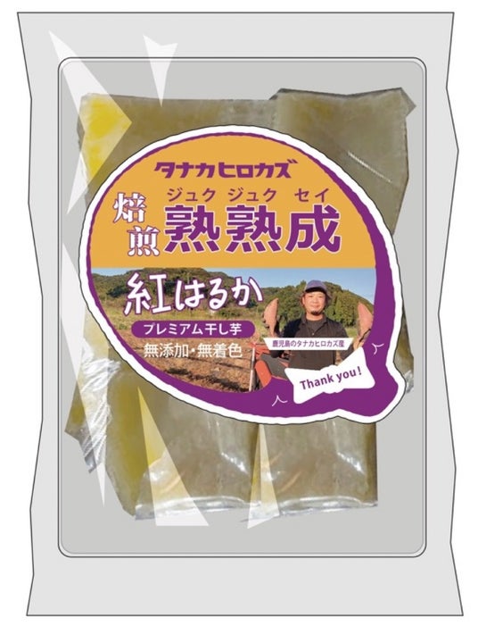 原料となる芋は、鹿児島県日置市「桜島の田中宏和さん」(39歳)がつくって収穫した「タナカヒロカズ2倍熟成紅はるかヌーボー2024」です。タナカヒロカズカンパニーでは、長年銀座の洋菓子店ブールミッシュで商品開発を担当してきたプロの食品コンサル「三浦海岸の田中弘一さん」(57歳)と芋の新たな美味しさ開発に挑戦する「芋ベーション」に取り組んできました。1.生芋の自然熟成期間を通常の倍以上にする、2.一つ一つしっかり時間をかけて良い生芋を選び抜く、3.通常のようにすぐに干すのではなく、火入れ加熱後に干す、4.無添加(砂糖も不使用)、無着色の芋のみの美味しさにこだわる、以上の工夫を試しました。その結果、「しっとりしたみずみずしさ」&「まったりとした上品な甘さ」を兼ね備えた干し芋が出来上がりました。この味のネーミングを検討するに当たり、桜島さんが「すごく熟成した味とジューシーな味だから“熟熟成(じゅくじゅくせい)”でいいんじゃないですか?!」の思いつき発言に乗っかり、「タナカヒロカズ焙煎塾熟成紅はるかプレミアム干し芋」という長い商品名に行きつきました。ちなみに通例として熟語「熟熟」は「つくづく」「つらつら」と読むのが正解ですので、漢字テストに臨むにあたってはご注意ください。