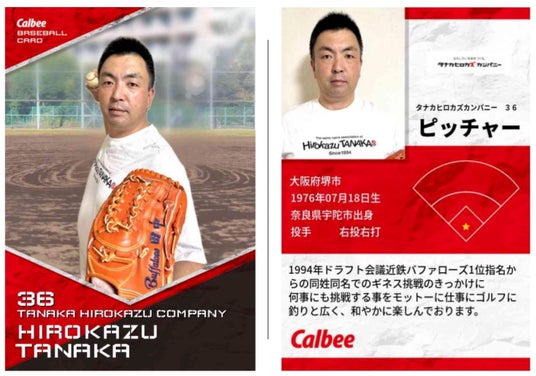 左:(表面)1994年のプロ野球ドラフト会議で近鉄バファローズから一位指名された「ピッチャーの田中宏和さん」(48歳)タナカヒロカズ運動の原点です。