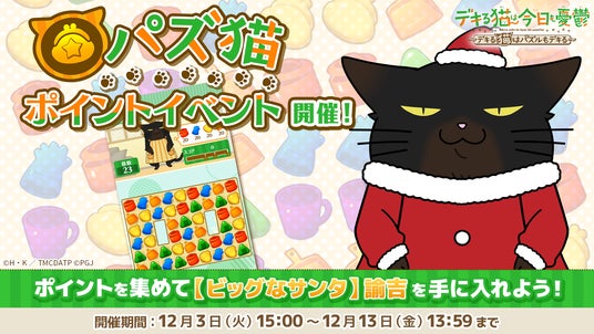 ポッピンゲームズジャパン株式会社(本社:東京都港区、代表取締役 CEO:谷口祐一郎)は、TVアニメ「デキる猫は今日も憂鬱」(略称:デキ猫)の新作スマートフォン向けパズルゲーム「デキる猫は今日も憂鬱~デキる猫はパズルもデキる~」(略称:パズ猫)がゲーム内イベントを開催することをお知らせいたします。