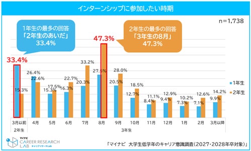 インターンシップに参加したい時期について大学1年生は「2年生の間」が最多