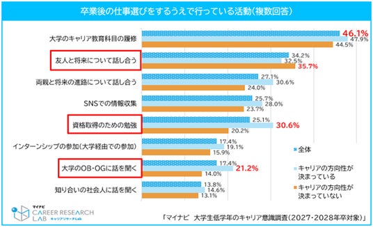 卒業後の仕事選びのために現在行っていることを聞くと、「キャリア教育科目の履修」が46.1%で最多だった。キャリアの方向性が決まっているかどうかで比較をすると、決まっている学生の方が「資格取得のための勉強」や「大学のOB・OGに話を聞く」の割合が多く、より具体的な行動に移していることがわかる。一方、まだ方向性が決まっていない学生は「友人と将来について話し合う」など、比較的に始めやすいことから取り組んでいることがわかった。【図3】