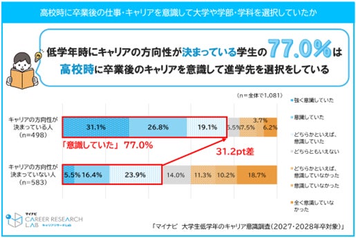 大学1・2年時にキャリアの方向性が決まっている学生は40.8%。方向性が決まっている学生の約8割は高校生の段階でキャリアを意識して大学や学部を選択