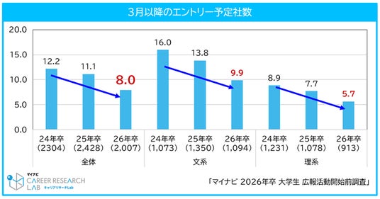 3月以降のエントリー(応募)予定社数は年々減少傾向にあり、26年卒では10社を割り、8.0社(前年比3.1社減)となった。文理で比較すると、理系学生のエントリー予定社数がより少なく、文系学生との差は4.2社だった。