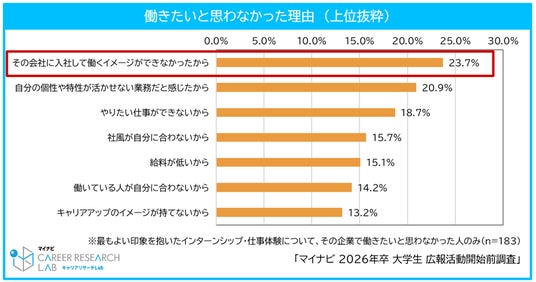 インターンシップに参加した企業について、その後の「採用選考に参加しない」という学生は7割を超えていることから、インターンシップを実施している企業であっても、採用選考の母集団形成が容易ではないことが予想される。また、最も良い印象を持ったインターンシップであっても、その企業で働きたいと思わなかった理由を聞くと、「その企業に入社して働くイメージができなかったから(23.7%)」という回答が最多となった。インターンシップでは実務体験を希望する学生も増えていることから、いかに具体的に入社後をイメージできるかが、採用選考応募へのポイントとなるようだ。【図4、5、6】