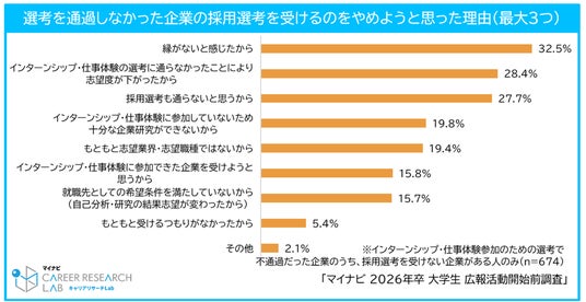 インターンシップ・仕事体験参加のための選考を設ける企業も多いが、選考を通過しなかった場合、その後の「採用選考に参加しない」という学生は56.6%と半数を超えた。採用選考を受けるのをやめようと思った理由としては、「縁がないと感じたから(32.5%)」、「インターンシップ・仕事体験の選考に通らなかったことにより志望度が下がったから(28.4%)」、「採用選考も通らないと思うから(27.7%)」などの回答が多かった。インターンシップ・仕事体験の実施は現場での実務経験を伴うため、受け入れる学生数を制限せざるを得ないケースが多い。3月以降のエントリー数減少が予想されることからも、母集団確保のために、一度は自社に興味を持った学生に採用選考に参加してもらえるよう丁寧なフォローアップが必要だろう。【図7、8】