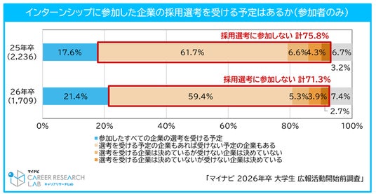 本調査は3月1日の広報活動解禁前最後の26年卒の学生調査です。インターンシップ・仕事体験への参加率・参加社数が過去最高水準となり、学生の就職活動準備が例年以上に進んでいると感じます。これから本格的な就職活動が開始されますが、半数を超える学生がインターンシップ・仕事体験の参加のための選考に通過しなかった場合、採用選考への参加を見送ろうと考えていることが分かりました。実際には運営上の都合で学生数を制限せざるを得ないケースも多く、そのため参加のための選考に通過しなかったからと言って、採用選考も同様の結果になるわけではありません。必要以上に落胆せず、志望度の高い企業に対しては、採用選考へのチャレンジに向けて準備をしていただければと思います。