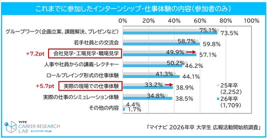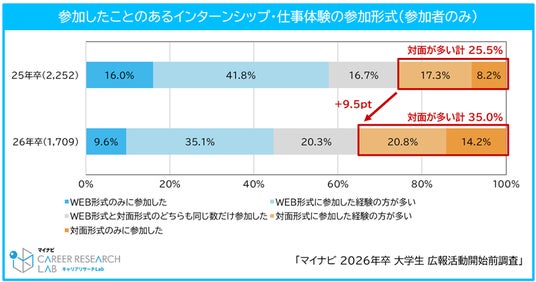2026年卒学生のインターンシップ・仕事体験の参加率は85.3%、平均参加社数は5.2社と、いずれも過去最高水準に達している。参加したことのあるプログラムの開催形式については、「対面が多い」が前年から9.5pt増加し、35.0%となった。参加したプログラムの内容として「グループワーク(企画立案、課題解決、プレゼンなど)」(73.5%、前年比1.6pt減)が最多だったが、「会社見学・工場見学・職場見学」(57.1%、前年比7.2pt増)や「実際の現場での仕事体験」(38.9%、前年比5.7pt増)など、より企業のリアルな様子がわかるプログラムへの参加が増えている。三省合意によるインターンシップの定義改正※から1年が経ち、タイプ3・4の実務体験を含むプログラムが拡充したことで、対面かつ就業体験型のプログラムに参加する学生が増えていると予想される。【図1、2、3】