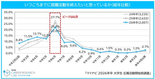 就職活動を終えたい時期のピークは例年と変わらず6月