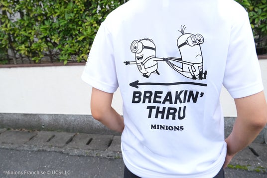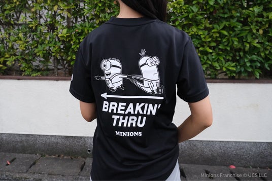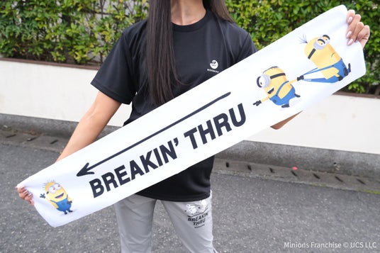 『BREAKIN’ THRU』(限界を超えよう)のメッセージとキャラクターをアイテムにプリント。日々のトレーニングを、自分のペースで続ける気持ちをサポートします。ROOM FITと「ミニオン」と一緒に、限界を超えよう。