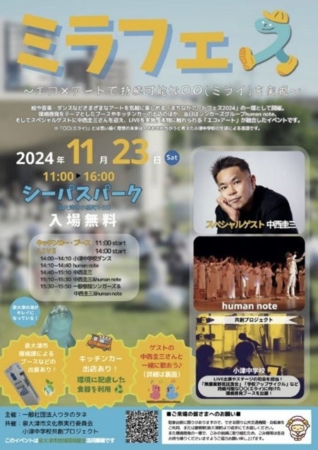 23日シーパスパークで行われる「ミラフェス」は、泉大津市立小津中学校との連携事業。イベント企画やネーミング、ステージパフォーマンスなどに小津中学生が関わっており、サブタイトルにある「〇〇(ミライ)」とは、思い描く理想の未来は人それぞれちがうと考えた中学生による造語です。小津中学生や協力団体による、環境啓発を目的としたブース出展もあります。