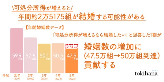 「可処分所得が増えれば、年間婚姻数が約2万5175組増える可能性がある」ことが判明!※1 さらに、年間婚姻数が増加することで出生数増加の予測がたち、少子化対策の鍵にも
