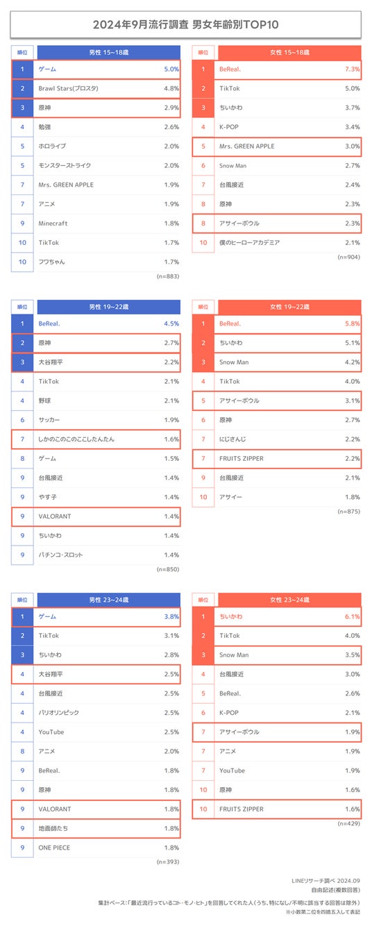 総合1位の「BeReal.」は、女性15~18歳と女性19~22歳で1位となり、6月期の調査結果(※)と同様にトレンドが継続している様子がわかります。女性15~18歳では、「Mrs. GREEN APPLE」が5位となりました。女性19~22歳と女性23~24歳では、「ちいかわ」や、「Snow Man」がTOP3入り。女性アイドルグループの「FRUITS ZIPPER」も10位以内に入っていました。また、「アサイーボウル」が女性すべての年齢層でランクインしました。