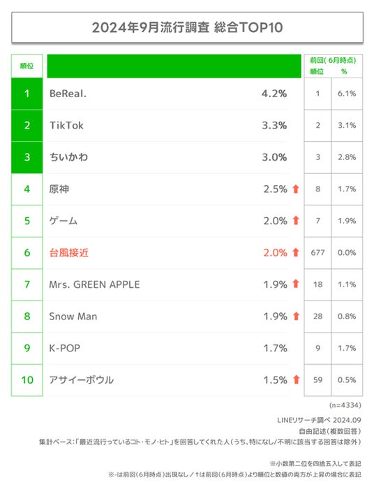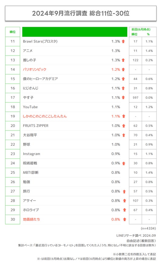 「LINEリサーチ」では、全国の15~24歳の若年層の男女を対象に、四半期ごとに最近の流行についてアンケート調査(自由記述形式)を実施しています。この度は、2024年9月の調査結果をお知らせします。