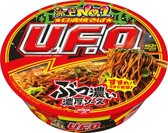 「ソースが食いたい!」そんなときに心もお腹も満たされるカップ焼そば。焼そばを鉄板で炒めたときの香ばしいロースト感を再現した“ぶっ濃い濃厚ソース”が特長です。商品名の「U.F.O.」は「うまい (=U) ソース、ふとい (=F) 麺、大きい (=O) キャベツ」を表しています。