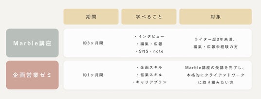 このような課題に応えるため、Marbleスクールは新たに「企画営業ゼミ」をご用意しました。2023年から「書く」+αのスキル習得と実践的な学びの場を提供し、今回で5期目を迎えます。5期では今までの「Marble講座」に加えて、仕事につながる実践力を磨くための「企画営業ゼミ」も開設し、持続可能なフリーランスライフの実現に向けた支援を強化します。
