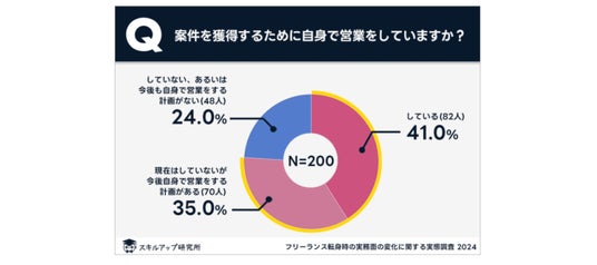 また案件獲得のための営業活動について、「営業活動を自身で行っている」が41%、「今後、営業をする予定がある」が35%と、7割以上が案件獲得のための営業が必要と考えています。