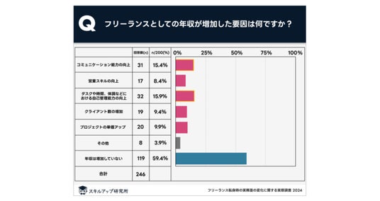 スキルアップ研究所が行った「フリーランス転身時の実務面の変化に関する実態調査」によると、フリーランスになって年収が減少した1番の要因は「営業スキル不足」という回答になりました。