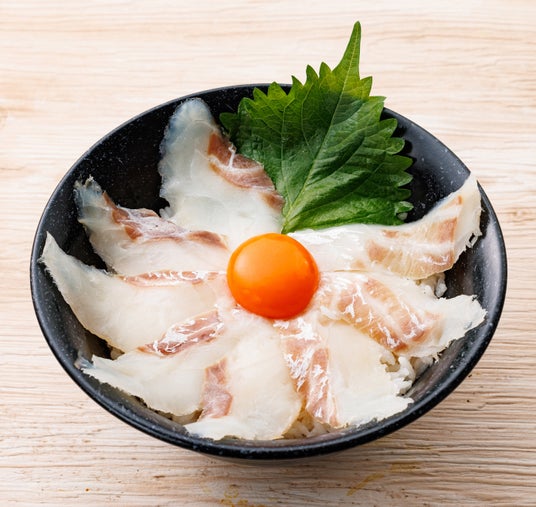 宇和島鯛めし<JFえひめ>第4回Fish-1グランプリの準グランプリメニュー。プライドフィッシュ「愛育フィッシュ愛鯛」を使って、宇和島の郷土料理に。ぷりっぷりのタイの身にタレと卵黄をからめてどうぞ。