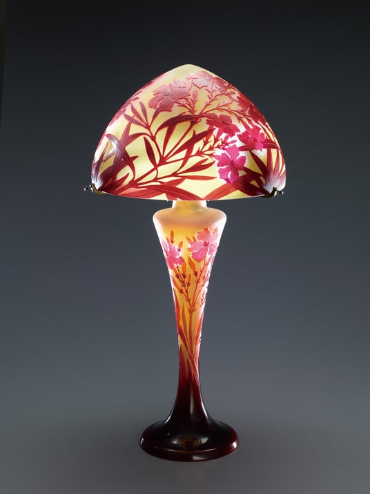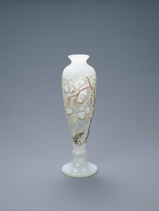 産業革命を経て、工業化が進む19世紀から20世紀初頭のヨーロッパで花開いた「アール・ヌーヴォー(新しい芸術)」。その中心人物として、ガラス工芸を芸術の域にまで高めたのが、フランスのガラス工芸家エミール・ガレ(1846-1904)です。ドイツ留学後にフランスのマイゼンタールでガラス技術を習得。故郷のロレーヌ地方ナンシーに戻ってからは、父親の事業に加わり、ガラス、陶器の製造管理をはじめ、商品開発やデザインなど芸術的指導を任されます。植物学者でもあったガレは、自然観察、植物学、生物学の知識を活かし、花々や昆虫などの生き物をモチーフに、自然美と生命の輝きをガラス工芸で表現しました。また、ジャポニスム(日本趣味)にも大きな影響を受け、日本美術との出会いにより、鷹や松など日本らしいモチーフをデザインに取り入れ、様々な技法で独自の世界観を創り出しました。1889年、1900年のパリ万国博覧会ではグランプリを受賞し、国際的評価を得、ガレの作品は一躍人気となります。1901年には産業芸術地方同盟(ナンシー派)を設立し、工芸の発展に貢献しました。本展は、没後120年となるガレの偉業を、70点を超える美しいガラス作品で振り返ります。