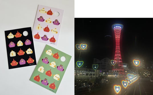 名古屋の人気スイーツ・ぴよりんと神戸ポートタワー、阪急電車のコラボフォロカード。カードの丸穴から光源をのぞき見ると、光源がハートに見えます。