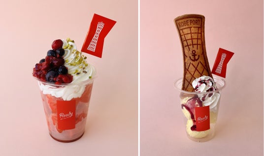 メゾンムラタさんのパンを使った赤いフレンチトーストパフェ(画像左)とポートタワー型バターせんべい付き 白いアイスクリームパフェ(画像右)