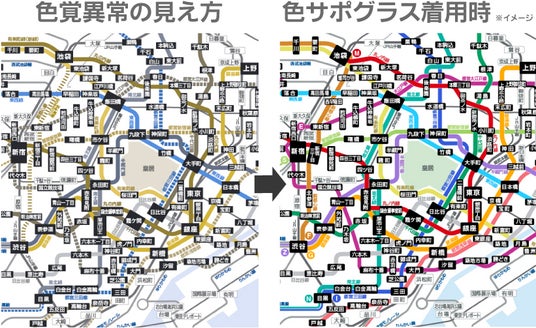 これまで区別が難しかった電車の路線図やエクセルのグラフも「色サポグラス」を着用すれば色の違いがより鮮明になります。