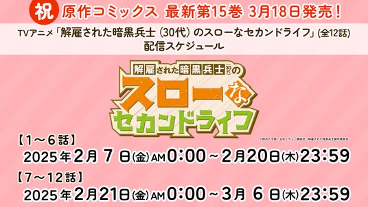 累計発行部数200万部突破の人気マンガ「解雇された暗黒兵士(30代)のスローなセカンドライフ」の最新第15巻が3月18日より発売予定!これを記念して、講談社が運営するYouTubeチャンネル「フル☆アニメTV」にて、TVアニメ「解雇された暗黒兵士(30代)のスローなセカンドライフ」全12話を期間限定で順次無料公開いたします。【第1話~第6話】を本日2月7日から2月20日まで、【第7話~第12話】を2月21日から3月6日までの期間限定配信となりますので、ぜひ原作コミックスと一緒にお楽しみください!