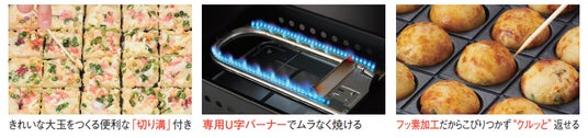 大阪発祥の企業として当社の威信をかけて開発したたこ焼器。「誰でも美味しいたこ焼き作りが楽しめる」を合言葉に、プレートやバーナー部の炎口の形状、火力など細部にまでこだわり開発、さらに、関西の数ある老舗たこ焼き店を開発担当者がくまなく食べ歩き、足と目と舌で徹底的に研究し尽くした商品です。2009年初代を発売以来、14年続くロングセラー商品です。
