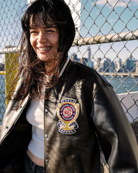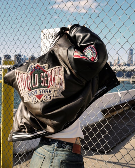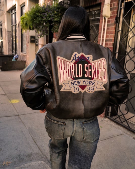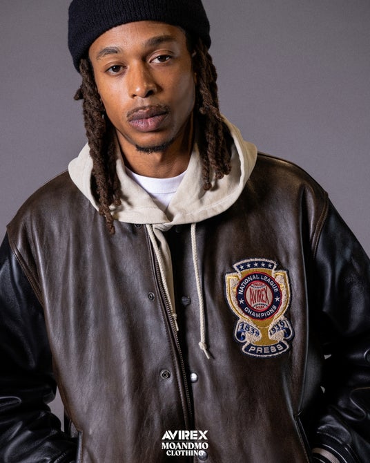 90年代の「AVIREX」の実際のヴィンテージピースをデザインソースにしたスタジアムジャケットは、ブランドを代表する厚みのあるアンティークラムで仕上げられ、当時の配色とは異なるモダンなカラーリングが印象的な一着です。
