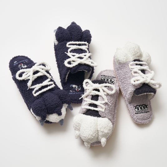 本コラボのために描き下ろしたキャラクターの足をモチーフにした、もっちりとした肌ざわりの’ ベビモコ’素材のルームシューズです。