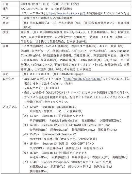 今般、下記のとおり、同法人が主催する「Jazz EMP @ Tokyo Financial Street 2024」を、日本橋兜町の新たなランドマークとして2021年8月に開業した「KABUTO ONE」の4Fホールを会場とし、多数の企業様のご協賛のもと、昨年と同じく有観客開催(「ストックボイス」でのオンライン配信とのハイブリッド開催)いたします。