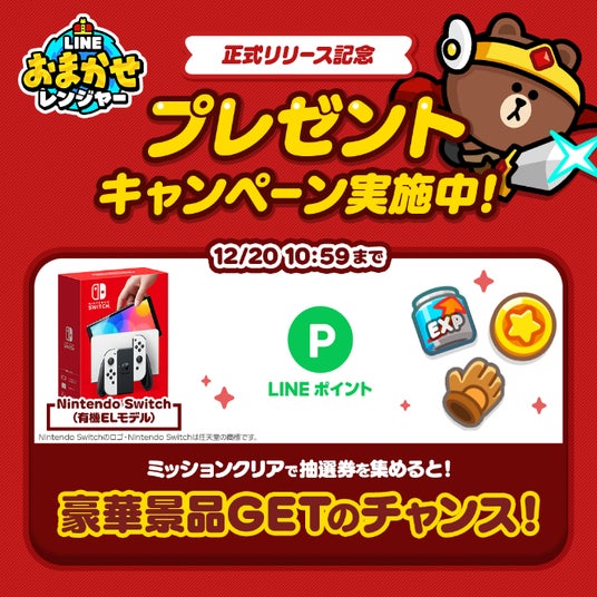 「LINE おまかせレンジャー」のリリースを記念したプレゼントキャンペーンを開催します。ゲーム内のさまざまなミッションをクリアして手に入る抽選券を集めて応募することでLINEポイントやゲーム内アイテムなどの豪華賞品を抽選でプレゼントします。