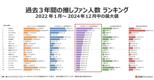 エンタテイメント業界に向けたデータ×デジタルマーケティングサービスを提供するGEM Partners株式会社(ジェムパートナーズ、所在地:東京都港区、代表取締役:梅津文)では、エンタメビジネスの最大化をサポートする商品「推しエンタメブランドスコープ(※1)」で毎月調査を実施しており、最新のエンタメブランド価値の計測が可能です。「推しエンタメブランドスコープ」は2022年1月から毎月調査をしており、この12月でちょうど3年間のデータが蓄積されました。そこで 今回、過去3年間のデータを用いて、人気エンタメブランドの推しファン人数が、TVアニメ化前後でどのように変化したのかを紐解きました。