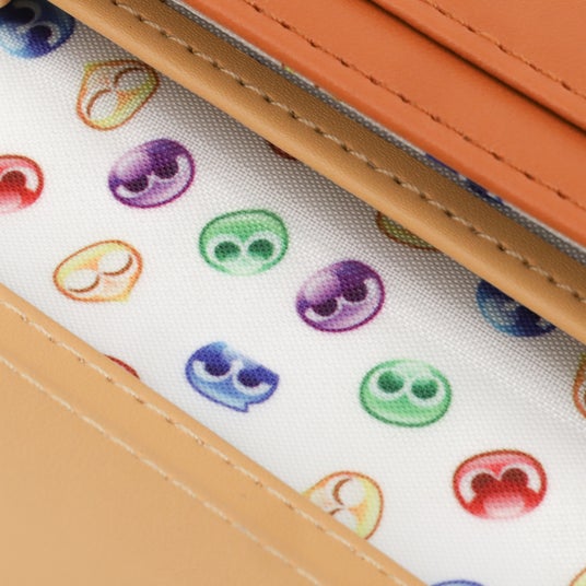 使い勝手の良いシンプルなデザインの合成皮革。裏地にはぷよぷよのチラシ柄をあしらい、開くとちらっと見えるカラフルさがアクセントに。持っているだけで気分が上がるようなおしゃれさが魅力の一つです。