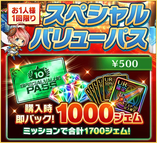 「スペシャルバリューパス」をご購入いただくと、即時に1000ジェム(500有償ジェム+500無償ジェム)に加えて「UR確定ガチャ剣(コスト20以上確定)×1」及び「UR10%ガチャ剣×5」を獲得でき、ミッションで獲得可能なジェムと合計で2700ジェムを獲得することができます!