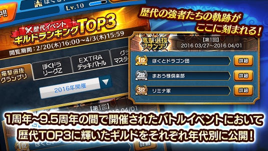 1周年~9.5周年の間で開催されたバトルイベントにおいて、歴代TOP3に輝いたギルドをそれぞれ年代別に公開!「歴代ギルドイベントTOP3」ページに歴代の強者たちの軌跡が刻まれる!