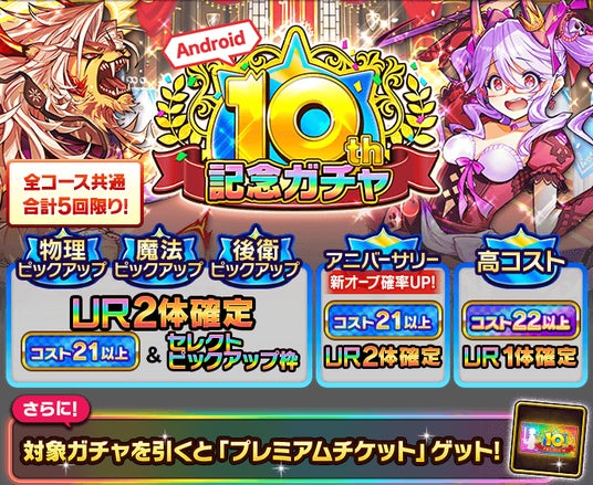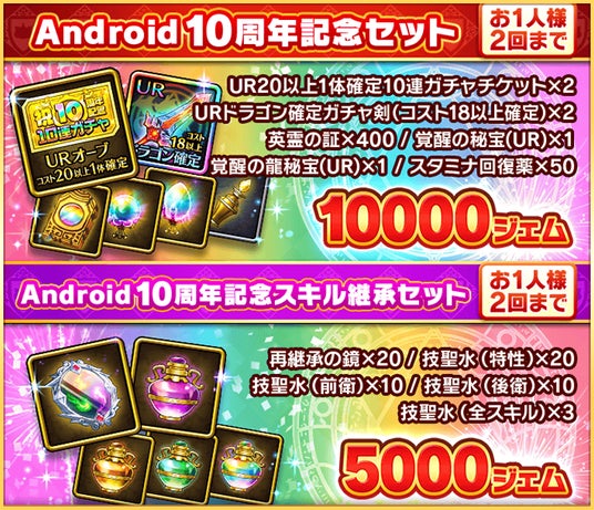 10周年を記念し「URコスト20以上オーブ確定10連ガチャチケット」や「URドラゴン確定ガチャ剣(コスト18以上確定)」、「英霊の証」を含む【Android10周年記念セット】のほか、「再継承の鏡」や「技聖水」を含む【Android10周年記念スキル継承セット】のアイテムセットを販売!