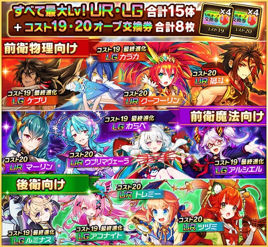 前衛物理・前衛魔法・後衛別のスターターデッキセットをご用意いたしました。バトルで即戦力になる強力なオーブが合計15体に加え、「URコスト20オーブ交換券×4枚」「URコスト19オーブ交換券×4枚」がセットになっている非常にお得な商品を期間限定で販売いたします。