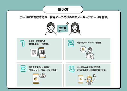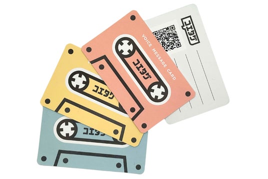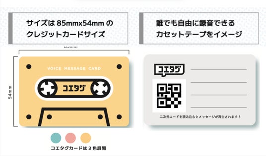 コエタグは、レトロなカセットテープを模したカードタイプで、QRコードを通じて簡単に録音・再生ができ、声をメッセージとして贈ることができるメッセージカードです。