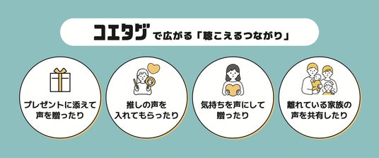 『コエタグ』は、誰かの想いが入った「モノ」として所有することで「いつでも聴ける安心感」と「持っている幸せ」を感じられる新しいコミュニケーションツールです。