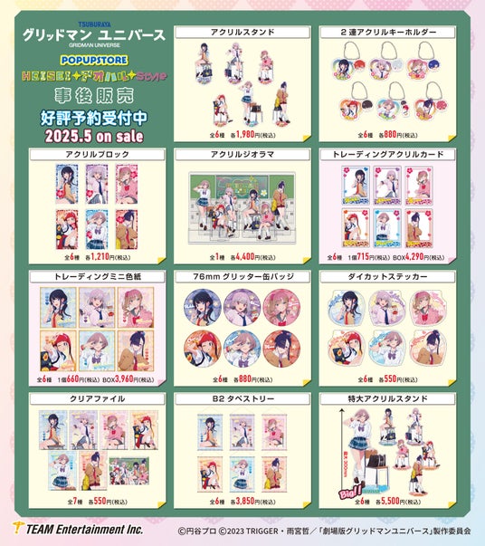 株式会社エディア(本社:東京都千代田区、代表取締役社長:賀島 義成)の子会社、株式会社ティームエンタテインメント(本社 :東京都千代田区、代表取締役社長 :賀島 義成 以下 :ティームエンタテインメント)は、2025年5月に、『グリッドマン ユニバース』のポップアップストアにおいて発売したオリジナルグッズの事後販売を決定したことを、お知らせいたします。