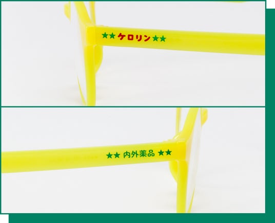 左右のテンプルにはケロリン桶に印字されたロゴをそれぞれ配置し、左右で異なるデザインが楽しめます。さらに、★マークがアクセントとして、ケロリンお風呂メガネに遊び心をプラスしています!