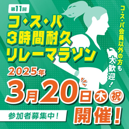 「コ・ス・パ」のブランド名で、フィットネスクラブ・テニスクラブ・キッズスイミングスクールの運営するほか、24時間営業フィットネスジム「FITBASE24」、高地トレーニングスタジオ「30peak」、公共スポーツ施設の受託運営など、関西圏を中心に計64店舗を展開する株式会社COSPAウエルネス(本社:大阪市中央区、代表取締役:大友 康彰 )は、2025年3月20日(木・祝)にヤンマースタジアム長居(長居陸上競技場メインスタジアム)にて子どもからシニアまで楽しめるマラソン大会、「第11回コ・ス・パ 3時間耐久リレーマラソン」を開催いたします。