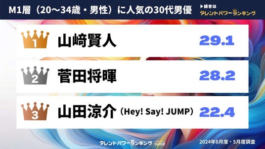 『タレントパワーランキング』では、タレントパワーランキングに登録されている30代男優について、M1層(20~34歳男性)とF1層(20~34歳女性)が回答した、それぞれの結果を調査。