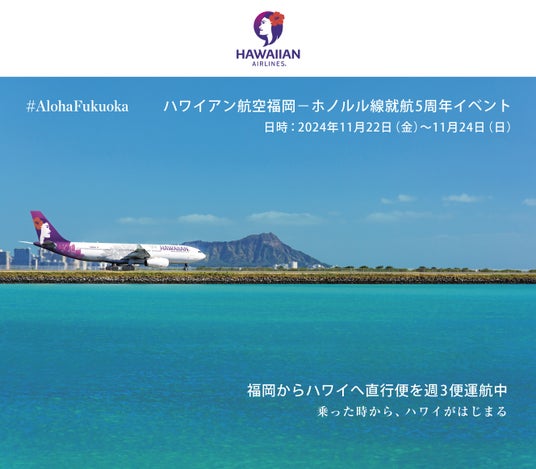 2024年11月に、ハワイアン航空福岡-ホノルル線が就航5周年を迎えます。