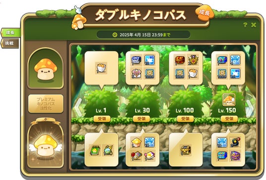 対象キャラクターが1度に3レベルずつアップする、人気の爆速成長イベント「ハイパーバーニング」や、専用マップでLv.200まで成長が可能な「テラブリンク」のほか、特典がさらに強化された「ダブルキノコパス」では、指定レベル達成やミッションクリアで、様々な成長アイテムと装備アイテムなどの報酬が手に入るなど、目的に合わせて多彩な成長支援イベントをご用意いたしました。この機会にキャラクターを一気に成長させましょう!