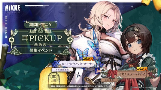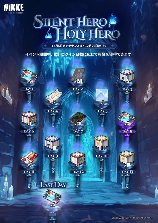このほか、期間限定ニケ再募集SSRニケ「ルドミラ:ウィンターオーナー」(CV:加隈亜衣)、SSRニケ「ミカ:スノーバディ」(CV:愛美)、新コスチューム「ベスティー - アークメイジ」に加えて、デイリー報酬として、募集チケット、育成素材を含む様々な報酬を獲得できる「14 Days Loginイベント:SILENT HERO, HOLY HERO」なども開催されます。ぜひ奮ってご参加ください。