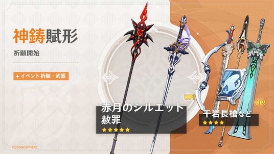 期間中、限定★5武器「長柄武器・赤月のシルエット」、「片手剣・赦罪」などの出現率が大幅にUPします。