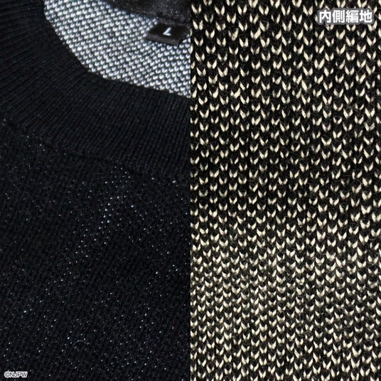 12ゲージのしっかりと度目を詰めた黒白糸のジャガードで編み上げ、