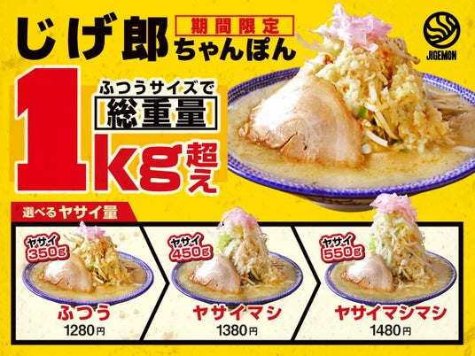 『熟成鶏豚骨 ごち麺屋 じげもんちゃんぽん』総重量1kg超の野菜マシマシ「じげ郎ちゃんぽん」を11月27日(水)より期間限定で販売